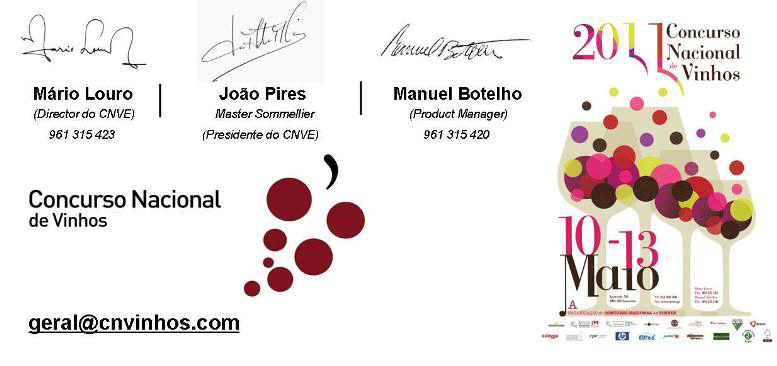 Mais ainda, a Direcção do Concurso, no sentido de facilitar a participação dos Srs. Produtores no CNV2011, abriu a página www.cnvinhos.com, onde poderão realizar a inscrição de vinhos na secção “Edição 2011”, na qual deverão ir a “Inscrições” (ou através do link http://frontendgp.cpcis.pt/). Entrarão no software do Concurso Nacional de Vinhos e poderão aí fazer a inscrição da Vossa Empresa, assim como das amostras a Concurso.