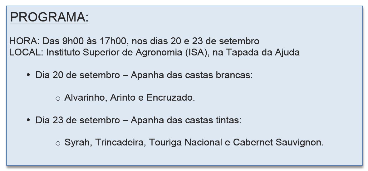 Apanha de 15 toneladas de uva na capital | SRP (19/09/2013) Por muitos desconhecidas, a verdade é que há vinhas e vindimas no centro da cidade de Lisboa, onde nos dias 20 e 23 de setembro decorre a apanha da uva nos cerca de 5 hectares do Instituto Superior de Agronomia (ISA). A Comissão Vitivinícola da Região de Lisboa (CVR Lisboa) tem a honra de convidar o V/ prestigiado Órgão de Comunicação Social a acompanhar este primeiro processo da vindima naquele Instituto, sita na Tapada da Ajuda, entre as 09h00 e às 17h00 horas. O ISA, derivado das obras que decorrem na sua adega, decidiu vender, pela primeira vez na história, cerca de 15 toneladas de uva à Casa Santos Lima, maior agente económico da região de Lisboa. ”É inédito ter um agente económico na vindima do Instituto Superior de Agronomia, cujo único fim é académico e que, pela primeira vez, serão comercializadas no mercado nacional”, afirma Vasco d’Avillez, presidente dos Vinhos de Lisboa. A CVR Lisboa vê, também, nesta operação uma importante aproximação entre esta instituição de ensino, que tem tido um papel chave na modernização de todos os processos de lidar com a vinha, obter frutos de qualidade e fazer um vinho sempre melhor, sendo que esta fonte do saber tem que estar em contacto permanente com os operadores de mercado.  NOTA: As visitas têm de ser acompanhadas e, por isso, requerem marcação prévia. Agradecemos confirmação de presença até ao final do dia 19 de setembro, quinta-feira, para o seguinte contacto.